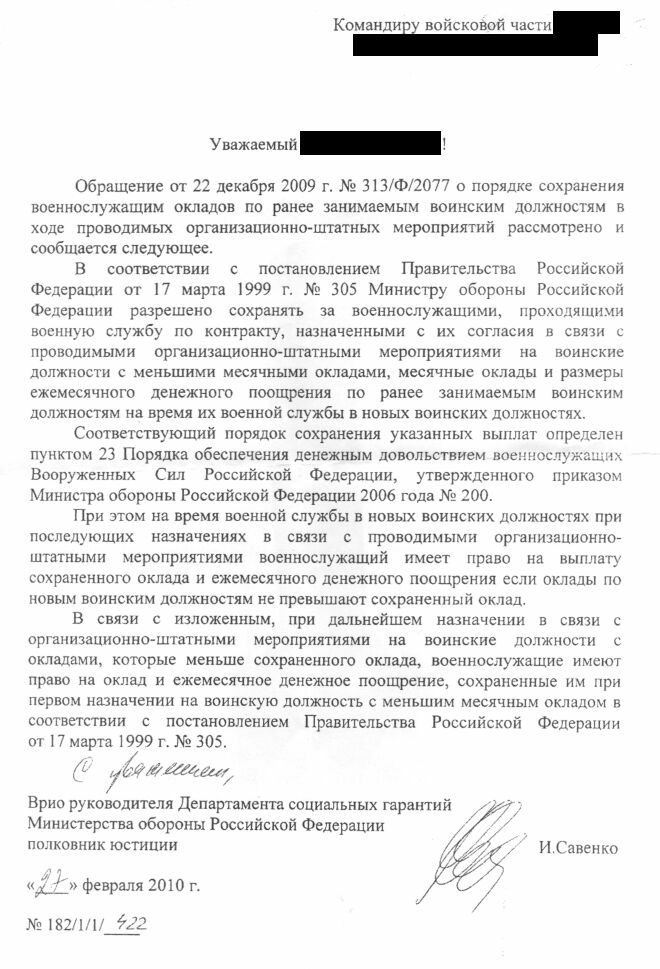 1) Постановление Правительства РФ от 17 марта 1999 г. N 305 "О сохранении за военнослужащими, проходящими военную службу по контракту, месячных окладов и размеров ежемесячного денежного поощрения по ранее занимаемым воинским должностям при переводе их на воинские должности с меньшими месячными окладами в связи с реформированием Вооруженных Сил Российской Федерации, других войск, воинских формирований и органов, в которых законом предусмотрена военная служба"