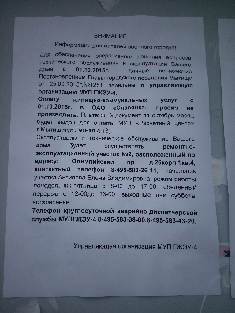 На фото с объявлением "ВНИМАНИЕ" от новой УО МУП ГЖЭУ -4 сказано: