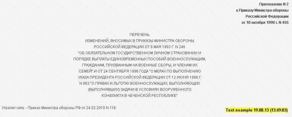 "Утратил силу. - Приказ Министра обороны РФ от 24.02.2010 N 116." - зайдите по ссылке, внизу страницы...