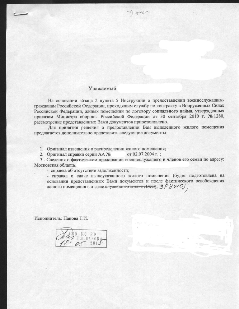 Вы невнимательно ветки читаете, минус вам. Писал как-то, специально позвонил инспектору в ДЖО, как раз узнать недостатки, ответили так же: не сдан оригинал извещения, не сдана справка о сдаче служебного жилья. На вопрос как же теперь жить дальше ответ был простой, при начале заселения сдаете оригинал извещения, выдаются копии доков на квартиру, по ним заселяетесь, сдаете служебную ЖП, по истечении срока, указанного в обязательстве на освобождение служебной ЖП, приносите справку и сдаче служебной ЖП, после этго мне выдаются подлинники документов на квартиру, с которыми я иду оформлять квартиру в собственность. Вот точно не помню, возможно, оригинал извещения потом сдается вместе со справкой о сдаче служебной ЖП.