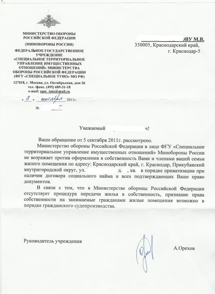 Еще один вопрос в тему, я так понимаю надо обращаться к собственнику, а где посмотреть есть ли приказ МО об оперативном управлении Собственностью РФ (на конкретный объект)?Югрегионжильё не является собственником указанной вами квартиры