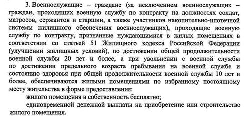А в проекте есть еще уточнение в скобочках:Джонs писал(а):Жилое помещение с "тремя желания" или компенсация - распространяется только на тех, кто увольняется по предельному возрасту или здоровью, (Проект ст.15 п.3 абз.1)