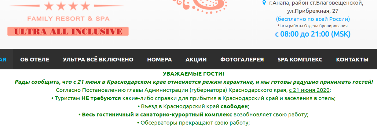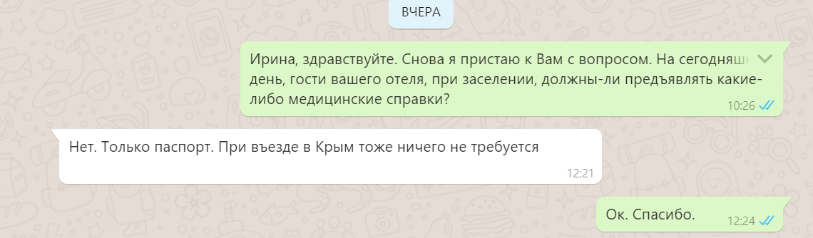 #13699Видимо так! Когда накрылась моя путевка на апрель в Судак, я решил всё равно съездить в Крым и забронировал номер в частной гостинице в Крыму на август. Вот моя переписка с хозяйкой: Далее. Сын перебронировал Турцию на Анапу. Вот информация на сайте отеля: Получается полный абсурд! Всё равно что, если бы половина водителей на дороге соблюдала бы правила дорожного движения, а половина-нет.Я вот что-то не пойму, теперь каждый санаторий сам себе Роспотребнадзор?