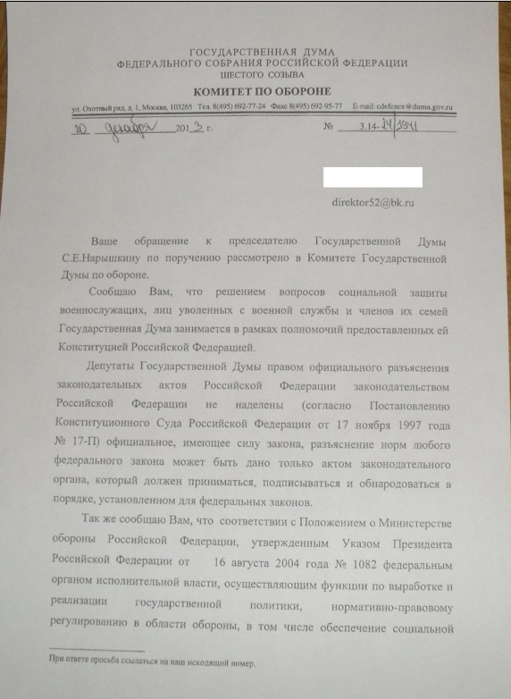 Ваше обращение к председателю ГД С.Е. Нарышкину по поручению рассмотрено в Комитете ГД по обороне. Сообщаю вам, что решением вопросов социальной защиты военнослужащих, лиц уволенных из ВС и членов их семей ГД занимается в рамках полномочий предоставленных ей Конституцией РФ. Депутаты ГД правом разъяснения законодательных актов РФ не наделены (согласно постановлению КС ОТ 17 ноября 1997 года №17-П) официальное, имеющее силу закона, разъяснение норм любого ФЗ может быть дано только актом законодательного органа, который должен приниматься, подписываться и обнародоваться в порядке, установленным для ФЗ.