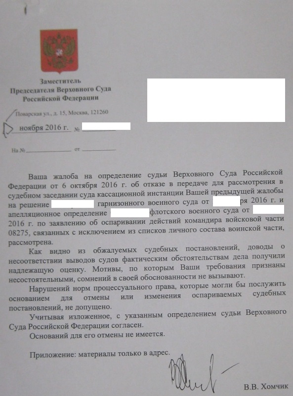 При этом у меня уверенность в том, что отвечал не Хомчик, - и документ не процессуальный, а как ответ на обращение. А подпись явно накарябана каким-нибудь шестым помощником младшего писаря канцелярии верховного суда.