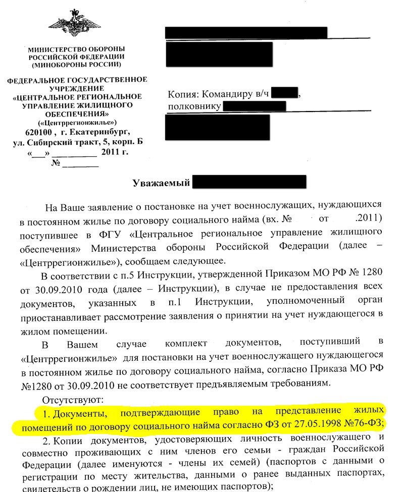 Здравствуйте. Пришел мне отрицательный ответ из "Центррегионжилье". Кто нибудь может подсказать, что им нужно конкретно предоставить по пункту №1 (на скане выделил желтым маркером)? Я предоставлял выписку команадира в/ч о выводе в распоряжение и справку о планируемом увольнении в 2011 году по ОШМ, но видимо этого мало? По пункту №2 выяснил - нужна еще и 19 страница паспорта. Календарная выслуга 14 лет.