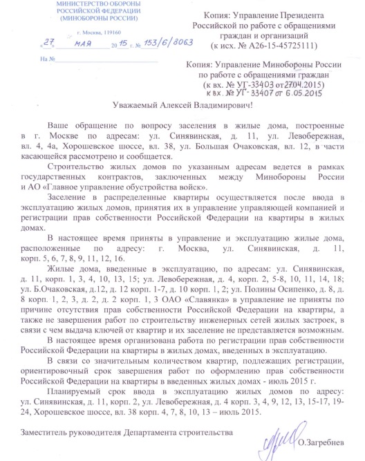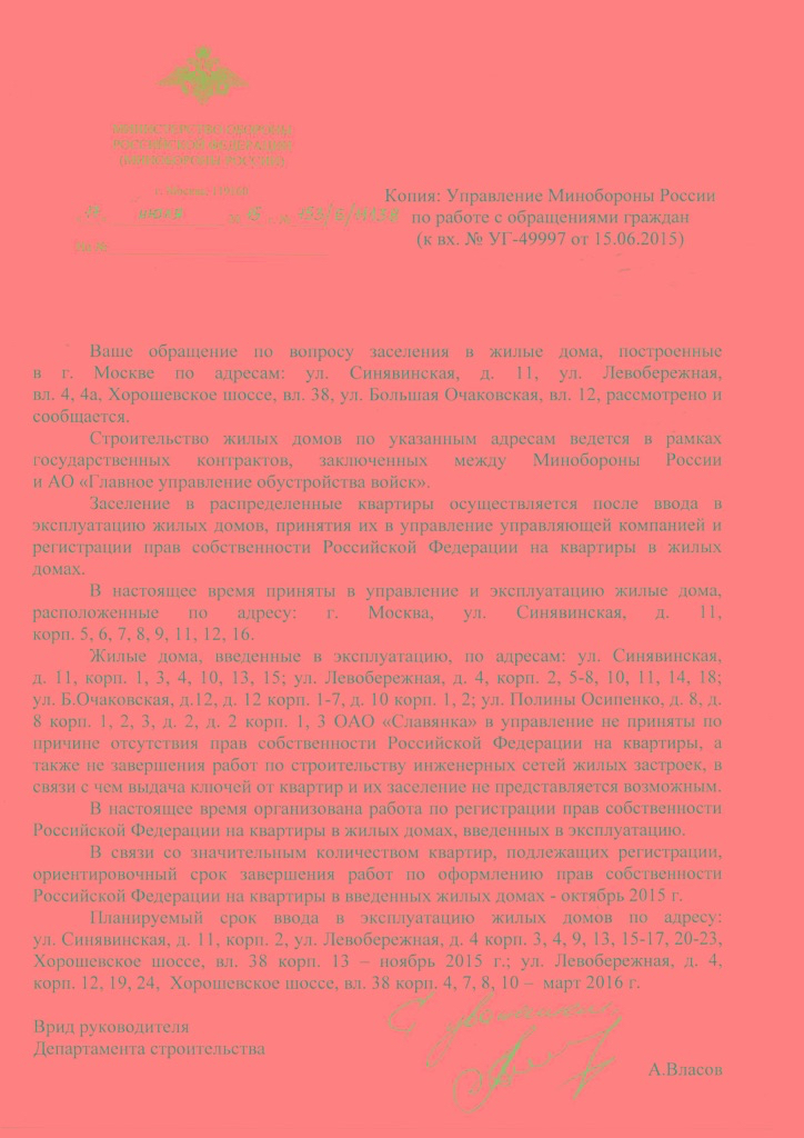 #14617Это явно не инициатива ДЖО, иначе была информация на сайте. Данное письмо - попытка заставить ДЖО выполнить свои обязательства, чему они будут активно сопротивлятся. Поэтому и требуется письмо с уведомлением, что бы в будущем было основание спросить с Пирогова С.В. о несоблюдении сроков оформления ДСН или передачи в собственность. Запись в ЕГРП свидетельствует о том , что квартиры отнесены к жилым помещениям, а следовательно они эксплуатируется и для оформления собственности не имеет значения кто управляет эксплуатацией СУ-155 или управляющая компания. Получив решение о передаче в собственность иоформив собственность вы сможете реально вселится в СВОЮ квартиру.придурковатая инициатива!!!! в собственность они отдадут квартиру и без вашего заявления в максимально сжатые сроки! и даже жить вам разрешат в ней...без газа без воды с неработающими лифтами...QR_BBPOST Друзья, как и обещал, скидываю образец заявления.....в настоящее время в джо около 20 таких заявлений от собственников корпуса 10 и 14..... письма сказали отправлять заказным письмом с уведомлением на имя пирогова.....кто имеет возможность привезти нарочным, то лучше привезите нарочным....всем удачи!!!