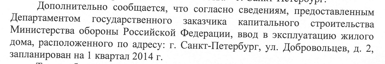 Несколько дней назад мы приезжали к воротам стройки с целью узнать не продаются ли в этих домах квартиры. Мужу сообщили, что полностью все дома предназначены только для военных. Данный район собираются вводить в эксплуатацию до весны 2014 года и далее квартиры поступят для распределения военным.