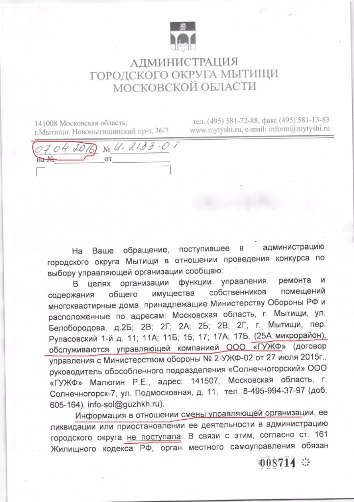 Судя по Вашему ответу из Администрации ГО Мытищи Администрация просто тонет в потоке обращений как минимум около сотни обращений в день принимает, они с такой копеечной работой по увольняютсяна хрен . И ответ на удивление быстро пришел, везунчик. А почерк прям Августовский особенно с жилищным фондом МО РФ, ул. Беобородова они просто грешат этим.