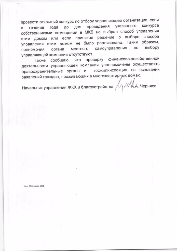 Просим Вас оказать содействие и дать необходимые поручения главе городского округа г. Мытищи провести конкурс в соответствии с частью 4 статьи 161 ЖК РФ.