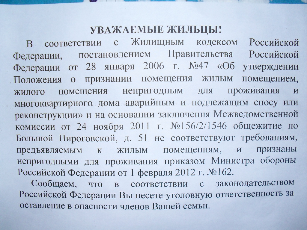 20.02.2012 г. я получил от начальника РЭУ № 8 ОАО «Славянка» уведомление от 09.02.2012 № 194/05/2530 за подписью врид директора Департамента жилищного обеспечения Министерства обороны РФ О.Харченко о выселении из общежития, (в котором фактически проживаю на законном основании по решению Хамовнического суда г. Москвы от 22.02.2011 г.) в связи с якобы признанием дома непригодным к проживанию. В приложении, ксерокопия приказа Министра обороны РФ от 01.02.2012 г. № 162, без подписи.