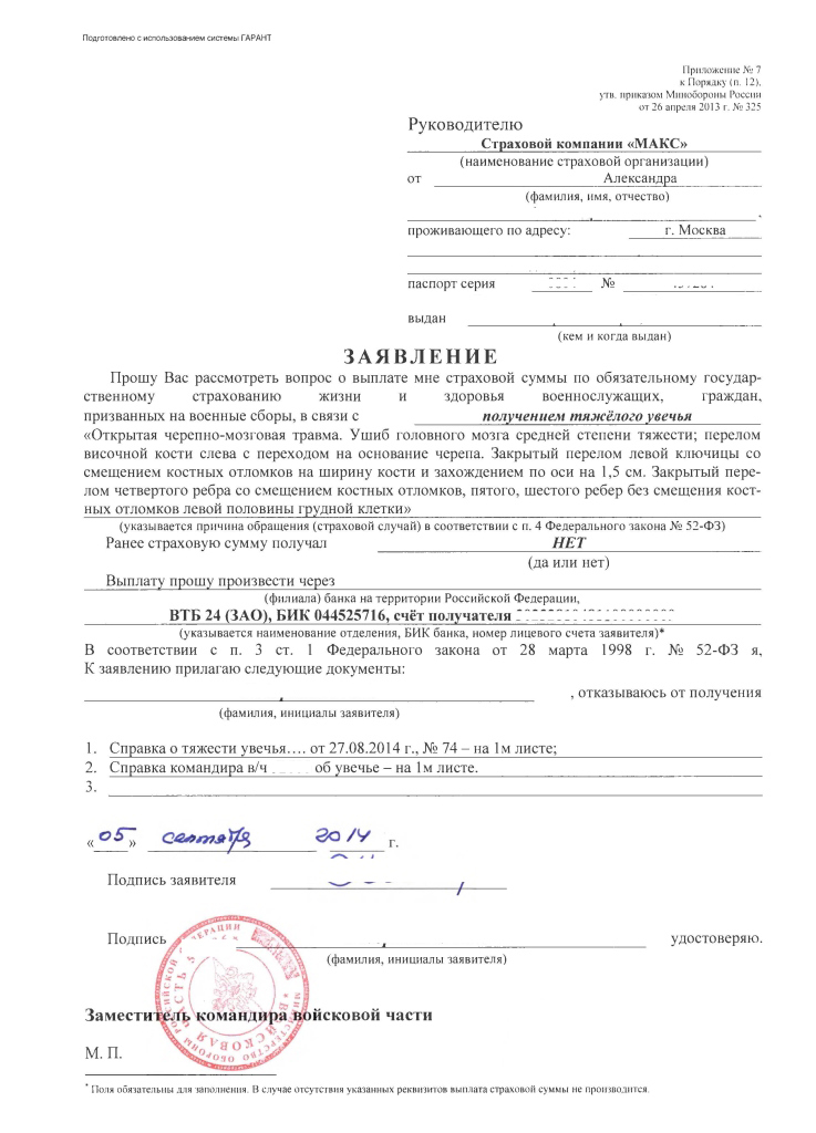 здравствуйте!! мой друг получил травму еще в далеком 1992 году когда был военнослужащим!! но тогда справки на получения страховки не дали!! щас можна если обратится в ВВК ее получить!!! спс!!