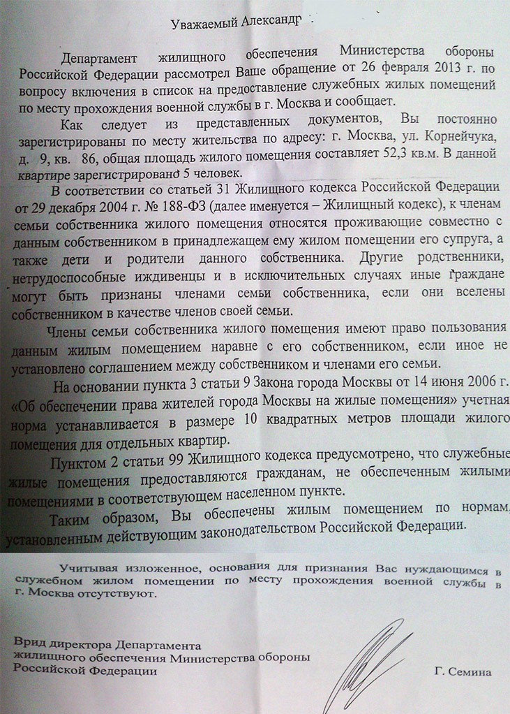 Доброго времени суток. Ситуация, воин прописан у родителей, там сестра с мужем своя семья, воин пытается встать в очередь на служебку, но из ДЖО приходит ответ