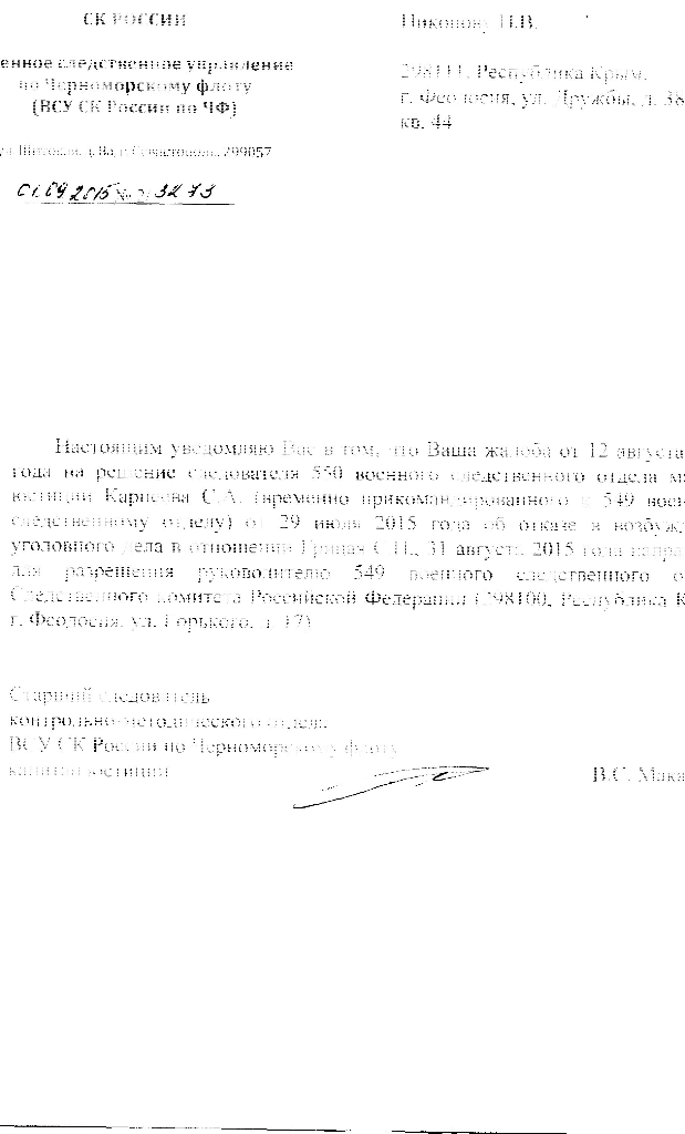 #1642Информация для бывших военнослужащих ЧФ. Подал в СК жалобу на привлечение капитана 1 ранга Грицая к уголовной ответственности за служебный подлог - распространение ложных сведений, указывающих на обеспечение военнослужащего войсковой части 78384 капитана 2 ранга Никонова жилой площадью за счет МО РФ. Да будет ему по делам заслуженная награда. Офицеру, какую бы он не занимал должность, нельзя врать!!! СК, в лице бывшего офицера ВМФ, а теперь следователя , прикрыл Грицая. Но я подал жалобу на сокрытие подлога. Ответ СК прилагаю.