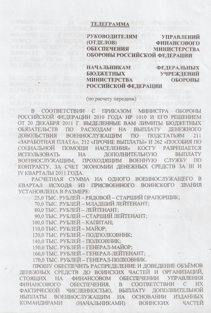 #1639За 1,2 квартал 2011 минимальная расчетная сумма была 30 и 25 т.р. соответственно, а вот кому сколько зависело по-моему от воинского званияЗа ссылочку спасибо. Но я же написал, что ознакомился с веткой поэтому и задал конкретный вопрос: расчетные суммы за 4 кв. 2010, 1,2 кв. 2011 года ИЛИ ИХ НЕ БЫЛО?На 3 и 4 кварталы смотрите вложение в пост № 1302, там в телеграмме Шевцовой указаны суммы!