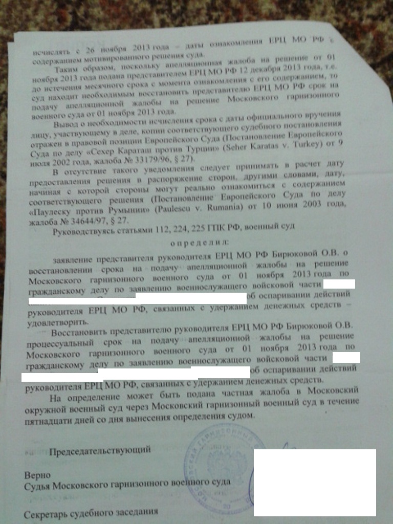 А как суд установил, что ЕРЦ получило решение , изготовленное 6 ноября, только 25 ноября? Должен был быть приложен конверт, в котором МГВС отправлял решение в ЕРЦ, на котором стоит штемпель "25 ноября 2013 г.", но я такого в определении не увидел!