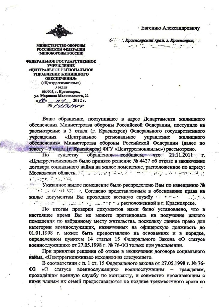 #1702Я и сейчас могу не ходить на службу и начать процедуру увольнения. Этим письмом-ответом они подтвердили, что обязаны были дать мне жилую площадь в 1996 году, когда я стал на очередь по новому месту службы, но до сих пор этого не сделали. От МО сейчас на руках справка о сдаче жилья.Не это ли не выполнение условий контракта со стороны МО? А у меня в карточке одни благодарности. Понимаю, что самая яркая проблема - личная, но почему все могут быть за 3 года до увольнения обеспечены жильём по ИПМЖ, а я такой особенный только в год увольнения? Я не увольняюсь по льготному основанию. У меня последний контракт, до предельного возраста, до 25.02.2015.не обижайтесь на убогих. Но согласитесь, что может возникнуть такая ситуация, что Вы будете увольняться не по льготному основанию. 3 года - большой срок. Например, Вы сейчас получите квартиру, быстренько приватизируете, а потом напишете рапорт на увольнение и перестанете ходить на службу! Не доверяют Вам...обеспечивать по ИПМЖ менее чем за 3 года до увольнения меня не будут