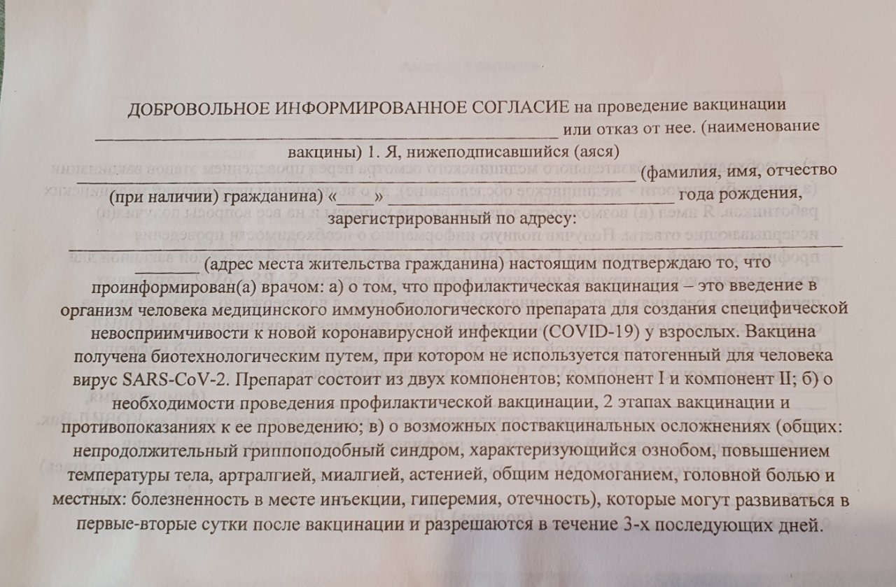 А вот как получить документ, подтверждаюший отвод от вакцинации - большой вопрос! Вчера общалась с зав.терапевтического отделения, которая отправила к профильному специалисту. Та, в свою очередь, дала справку с диагнозом и назначила явку со свежими анализами и т.п. Но при этом предупредила, что выдать документ, подтверждающий ОТВОД от прививки, она все равно не сможет, т.к. в ее функции это не входит.Сегодня пообщалась с начмедом поликлиники, которая выдала талон на завтра на прививку (ее в конечном итоге можно не делать), но в ходе посещения перед "уколом" посетить врача, который должен перед прививкой вынести окончательный вердикт. Посетила сегодня и этот кабинет (без талона), ответили, что окончательный вердикт должен вынести профильный спецалист или зав. терапевтического отделения по справке специалиста..... И все опять пошло по замкнутому кругу...Вроде, все всё понимают, но в итоге - никто не хочет брать на себя ответственность. Завтра пойду по талону, т.к. прием будет вести врач иммунолог. Вся надежда на него. В кабинете взяла занимательную "бумажку" на 4-х листах, которая называется "ДОБРОВОЛЬНОЕ ИНФОРМИРОВАННОЕ СОГЛАСИЕ на проведение вакцинации или ОТКАЗ от нее". Вот как круто придумано. Жаль, что отказ не прокатит для санатория. Буду настаивать на внесение в данную "премудрую" бумагу полный диагноз профильного врача. Прививку, я конечно, завтра ставить не собираюсь, т.к. ДОБРОВОЛЬНО-ПРИНУДИТЕЛЬНО сомнительные эксперименты проводить над своим организмом пока не готова. Свое заболевание я нашла в инструкции к вакцине в разделе "противопоказания" и распечатала этот раздел.