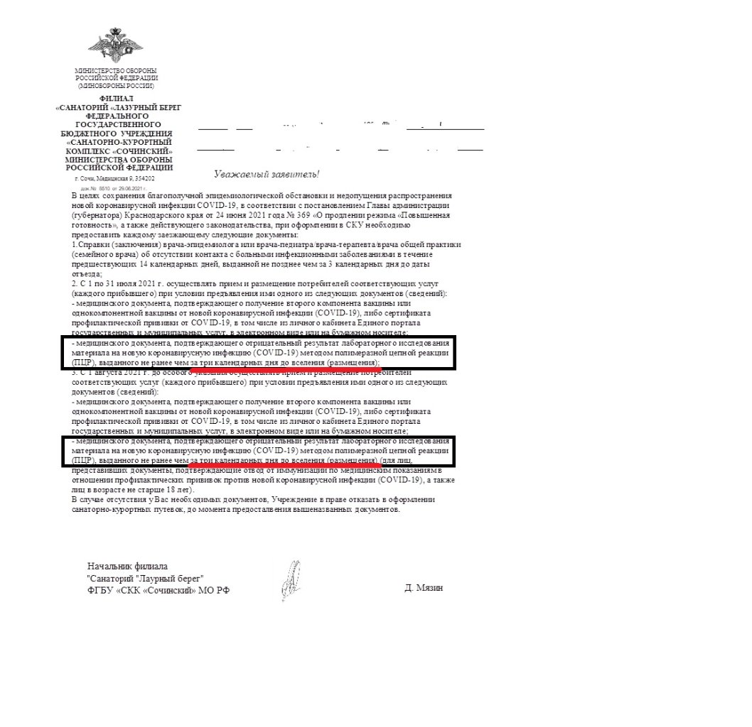 #16905Nana. У нас с приятельницей в прошлом году были справки, полученные в разных поликлиниках, такого же содержания, как предлагают выдать Вам. Отдыхали в ЛБ (филиал Сочинского). Все прошло нормально. Но в этом году всё ужесточили до предела, поэтому о требваниях к содержанию данного документа и по др. вопросам буду звонить в санаторий чуть позднее и все уточнять. Попытайтесь все-таки дозвониться до санатория, либо на ГЛ МО, или в Роспотребнадзор, в структуре которого теперь и бывшие СЭС. В любом случае, если на выяснения времени нет, то берите хотя бы то, что дают. Если у Вас сертификат вакцинации, то могут в случае возникновения претензий к содержанию справки предложить сдать тест ПЦР. Так поступили с дамой в прошлом году, но у нее проблемы были со сроком выдачи справки (за 4 или 5 дней). Можно еще кроме Роспотребнадзора позвлнить в комитет здравоохранения вашего города.