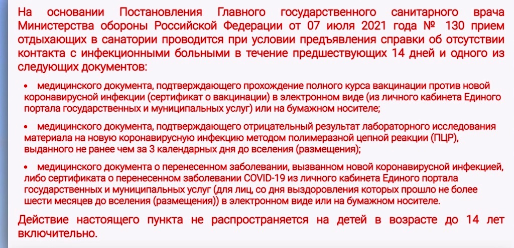 #16961На сайте МО опубликованы требования к отдыхающим из Постановления Главного гос. сан. врача МО РФ №130 от 07.07.21г. https://sc.mil.ru/social/health/sanator ... uction.htm