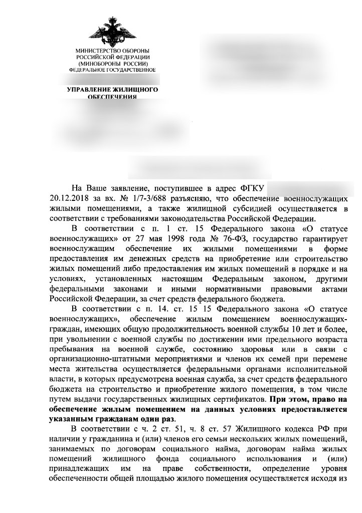 Получил сегодня письмо с ответом от РУЖО на мой запрос о том, имеет ли право член семьи, участвовавший в приватизации жилья в совершеннолетнем возрасте государственного или муниципального фонда, на обеспечение субсидией от МО РФ. При этом я в запросе указал, что мне лично известны факты обеспечения субсидией в полном объеме, без вычитания метров, при приватизации муниципального жилья членом семьи военнослужащего, за пределами 5-летнего срока его отчуждения.