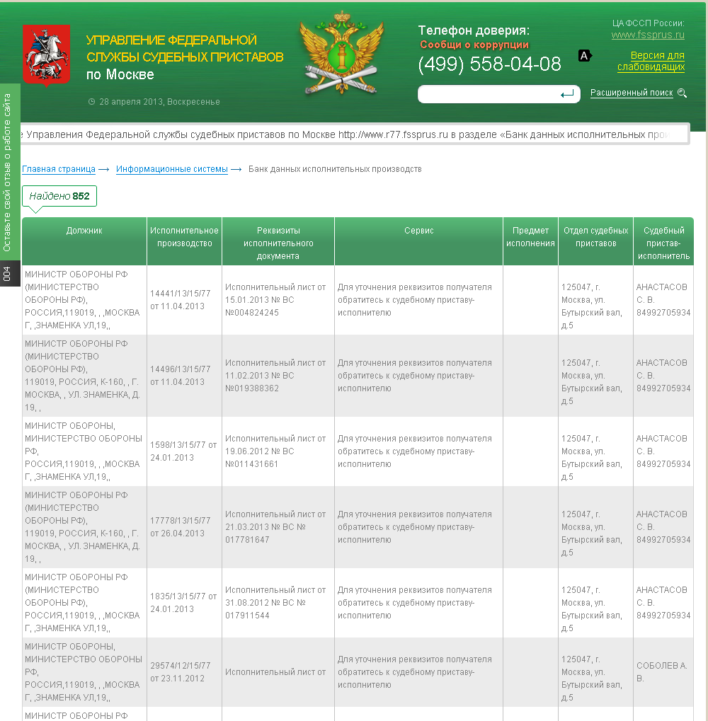 - должник Министр обороны (МО РФ) - 908 исполнительных производств;