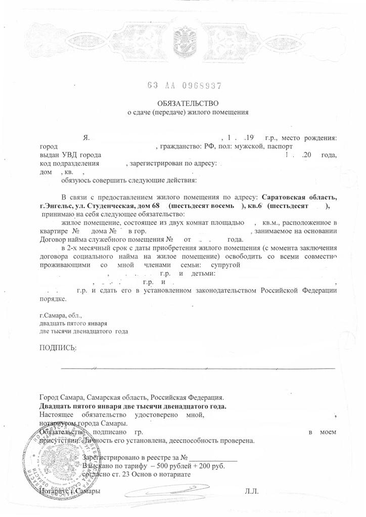 Так это и есть обязательство? Оно же Согласие? Если честно, то думал что его форма иная. В приложении № 1, к постановлению Правительства РФ от 6 ноября 2009 года № 903 это Обязательство о сдаче (отчуждении) жилого помещения имеет другую форму….воин66 писал(а):Справку о сдаче жилья буду получать под нотариально заверенное обязательство о сдаче жилья после заключения ДСН. В обязательство вписываются члены семьи, и там они ставят свои росписи. Значит получается что обязательство одно на всех? Да.
