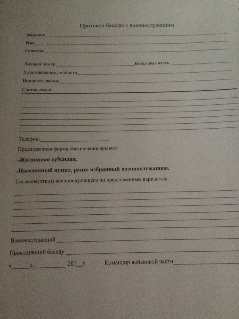 Доброго времени суток. Нахожусь в распоряжении по ОШМ до обеспечения жильем. Заставляют заполнить (видимо в свете поправок к Закону о статусе) протокол (во вложении). Вступать в конфликт с командованием вариантов нет - примите как данность, какой-то ответ придется дать.