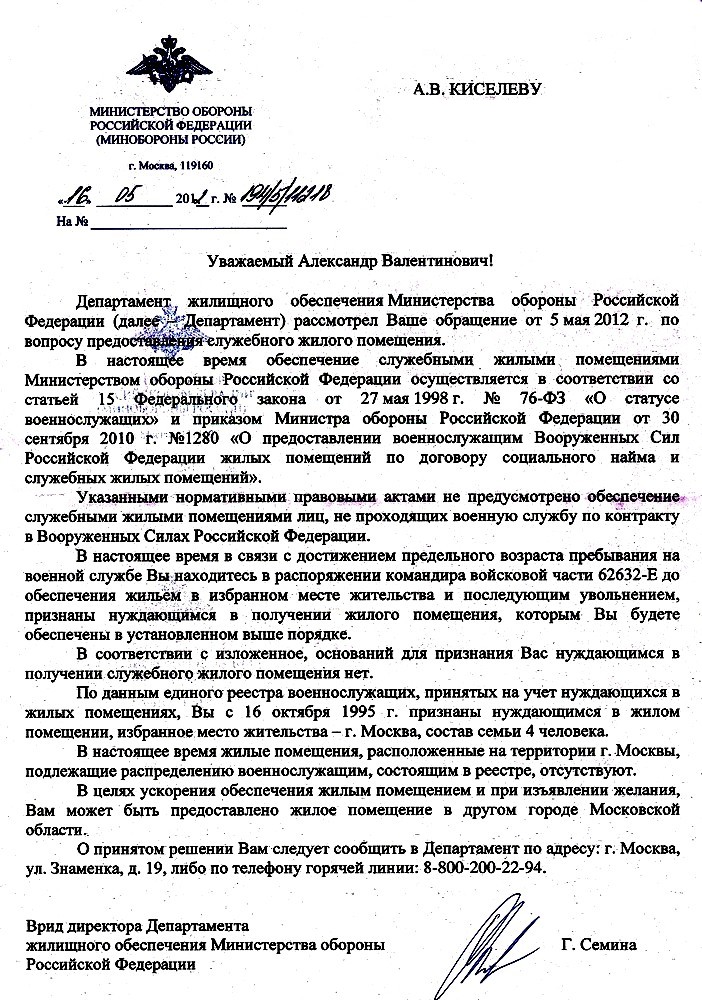 МО не есть населённый пункт, где в/с проходит службу и где ему положено служебное жильё. Всё остальное словоблудие про прибытие и убытие со службы.Мои доводы, что НУЖУ не применяется в отношении служебного жилья, привели их к мысли, что все равно нельзя, т.к. он женился и у жены есть ЖП в МО.