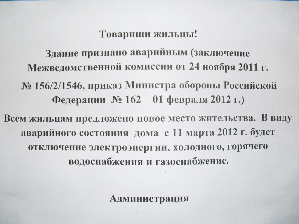 Вообще попахивает очередным пустословием (об объявлении), т.к. в приказе : выселить до 31.03.2012 и до полного отселения обеспечить обслуживание помещений. А тут 11.03.2012 отключить.