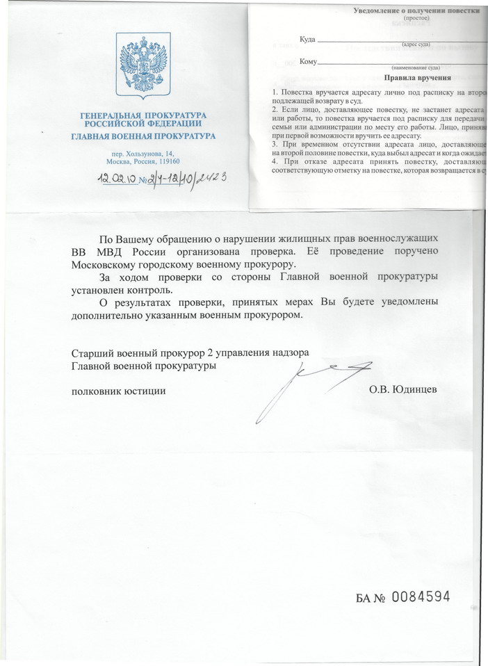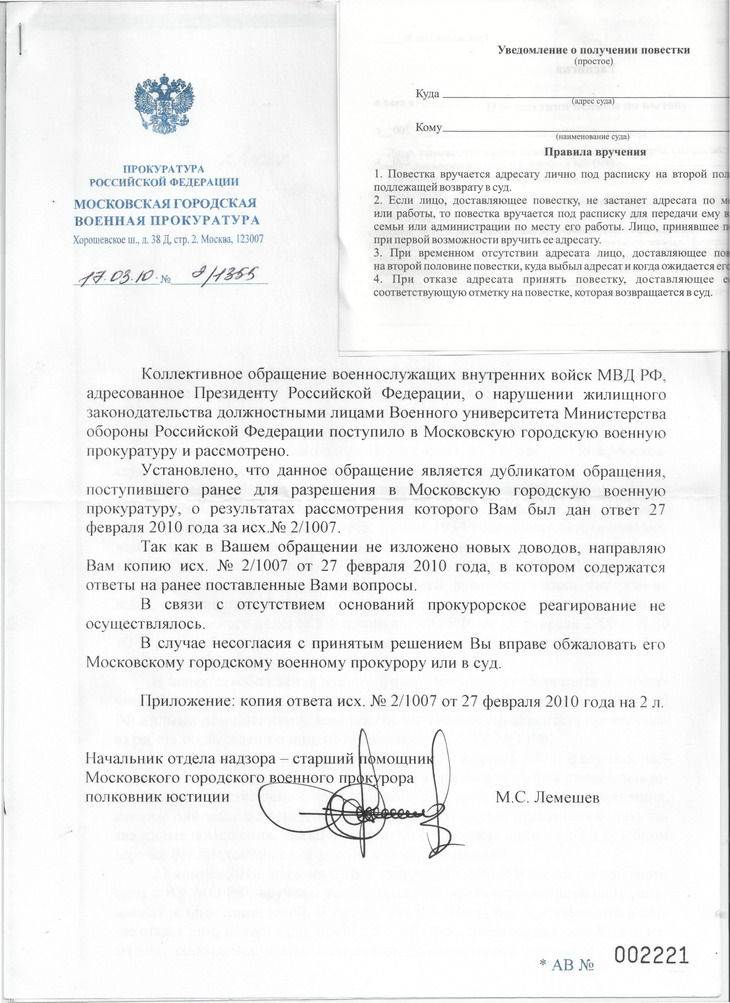 Отписка не заставила ждать:В связи с выше изложенным, прошу Вас провести проверку наличия в действиях должностных лиц Министерства обороны РФ, (связанных с не предоставлением жилого помещения по договору социального найма при переселении из жилого помещения, непригодного к проживанию), состава преступления, предусмотренного ст. 125 Уголовного кодекса РФ (Оставление в опасности меня и членов моей семьи). При наличии признаков, прошу возбудить уголовное дело.