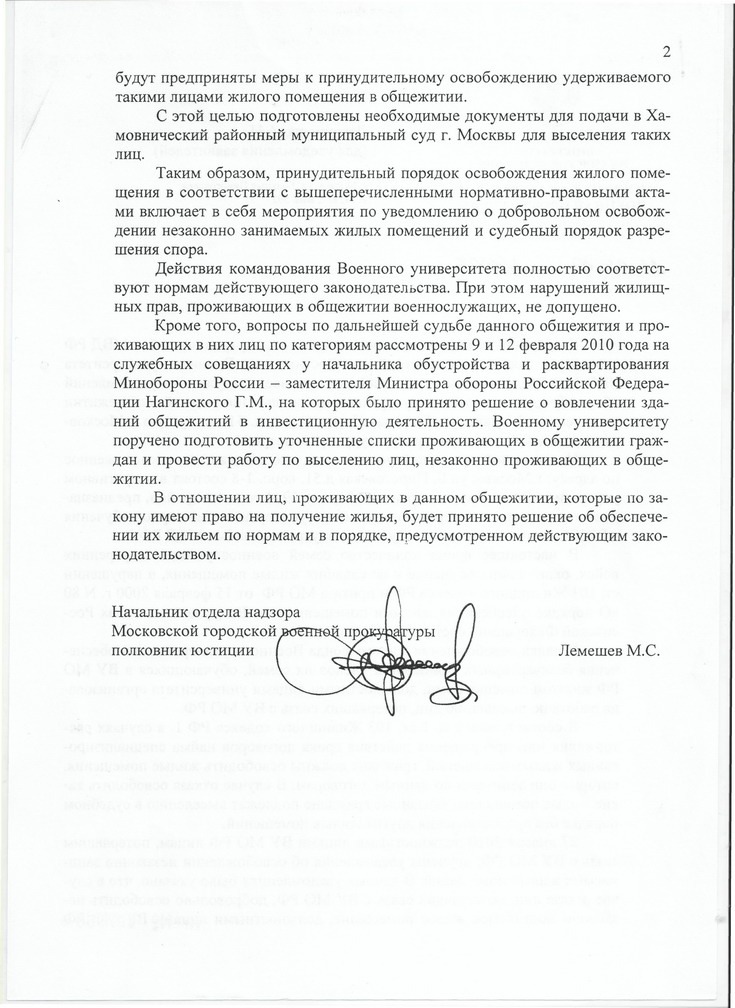 По расселению: Готовятся документы по всем "университетским" (18+4) для передачи в Хамовнический суд о выселении с предоставлением на Планетной по непригодности помещений общежития для проживания. Истец - отдел претензионной работы МО РФ.