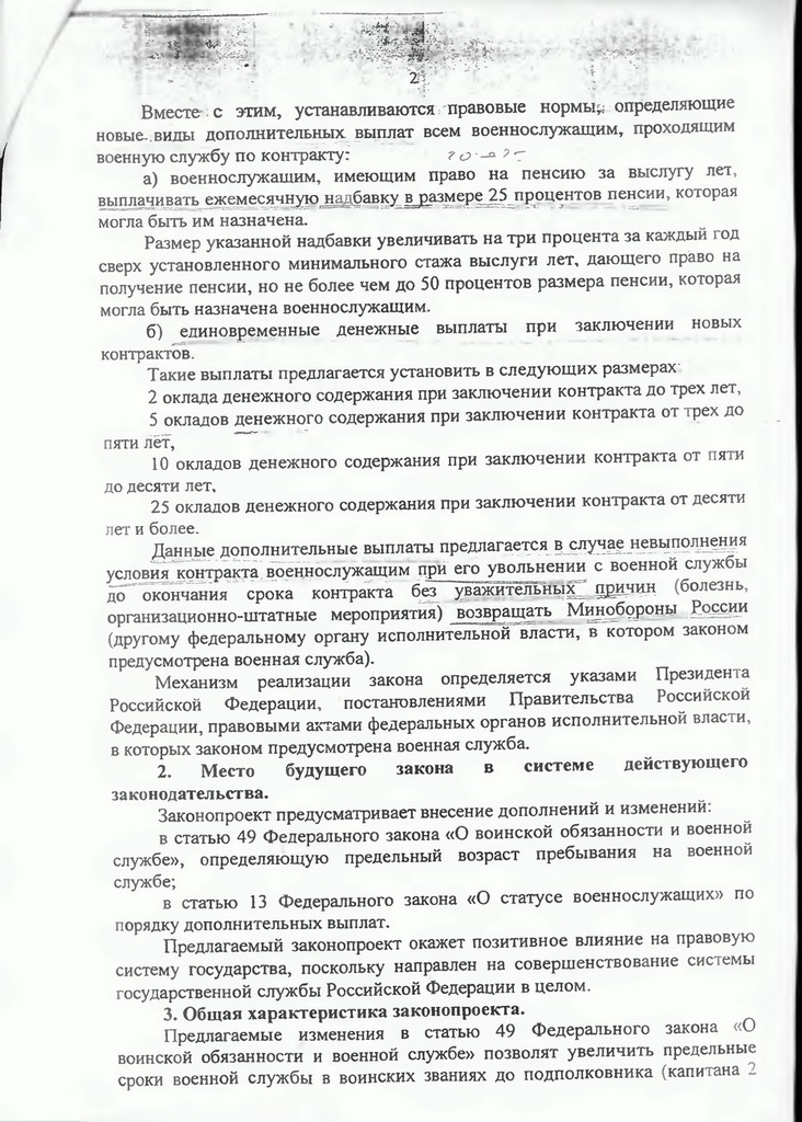 МО РФ кроме увеличеняя срока службы, предлогает всем военнослужащим крепкое здоровье, а так же увеличит продолжительность срока жизни для каждого военнослужащего, за счет средств федерального бюджета. Нужно и можно увеличить срок заключения контракта о прохождении службы только для желающих, а уход на пенсию и предельный возвраст оставить прежним 45 лет. В 32 года я стал инвалидом вследствии военных травм-две тяжелых контузии и тяжелое пулевое - 2 группа. В 43 года у меня обнаружили злокачественную опухоль, проще говоря рак. Химия не помогает. Какое увеличение пенсионного возвраста может быть, если многие увольняются в свои 40-45 лет полностью не годные к службе с букетом различных болезней и которые ВВК почему то не связывает со службой, но все приходят служить полностью здоровыми. Мне с наличием гематом в лобно теменных облостях, наличием осколка в голове на ВВК в Подольске вместо закрытых черепно-мозговых травм первоначально записали заболевание головного мозга- (в Чечне минингит на ногах перенес), осколок в башку с минингитом залетел, хотя про осколок умолчали. А при повторном МРТ головного мозга врач проводивший МРТ чуть с ума не сошел, обозвал меня мудаком и сказал что он мог и статью за мое убийство заработать так как магниты могли сместить осколок и при прохождении осколка через мозг мне был бы конец. Контузии подтвердил через суд пройдя ряд экспертиз, а так же суд опросил всех сослуживцев бывших очевидцами полученных мною контузий. Правда контузии можно было подтвердить и сразу дав взятку деятелям из Подольского ВВК, в размере 800 зеленых бумажек о которых они не взначай говорили в моем присутствии, одному на ремонт машины 500 и другому еще на что то 300. Так что срок предельного возраста службы 45 лет, а желающим можно продлить контракт до 50 лет. А по травмам нужно вобще формулировку менять, не зависимо от того где получена травма во время боевых или на службе при исполнении все должно быть "Военная травма", ведь наша служба связана со значительным риском для здоровья. Нет армии нет и государства, это должны понять все.