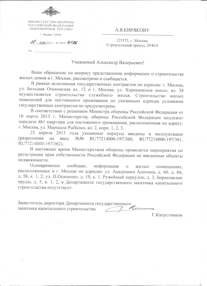 По вопросу отсутствия у Минобороны возможности обеспечения жильем выкладываю скан ответа Департамента ГЗКС МО РФ. Кроме того, в соответствии с ранее действовавшим приказом № 80 (пункт 37 Инструкции) жилые помещения должны распределяться за 2 месяца до сдачи жилого дома в эксплуатацию (срок сдачи на Маршала Рыбалко - 25 апреля 2013 г.), т.е. в период царствования сердюкова квартиры по ул. Маршала Рыбалко, вл. 2 распределяться не могли. То же самое и по другим адресам: П.Осипенко, д. 10, корп. - 75 кв.; ул. Академика Анохина, д. 66 - 48 кв. и т.д.