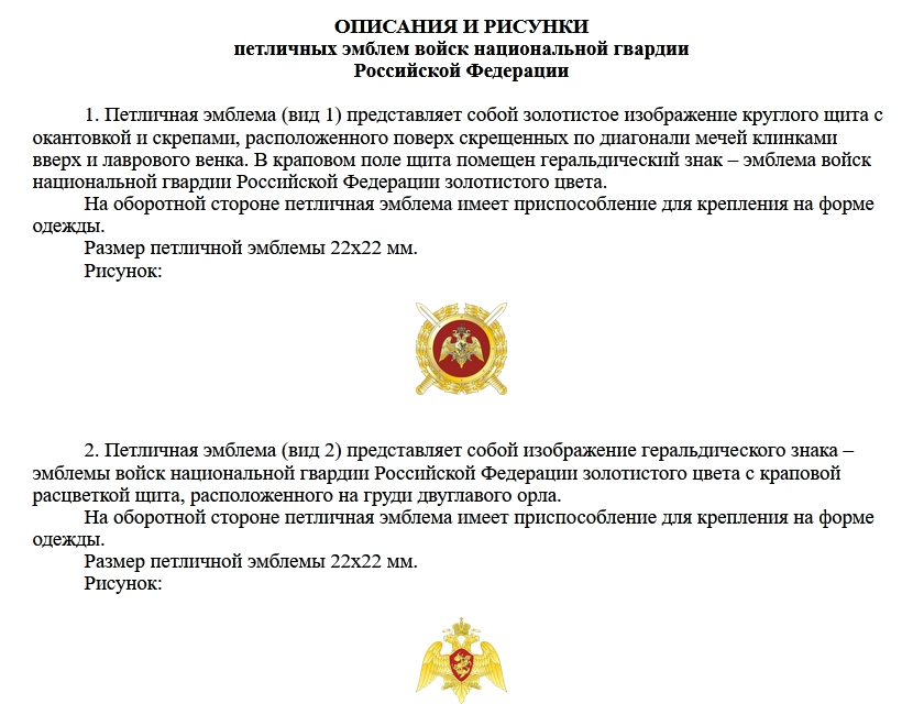 "Об учреждении петличных эмблем войск национальной гвардии Российской Федерации, утверждении их описаний и рисунков".