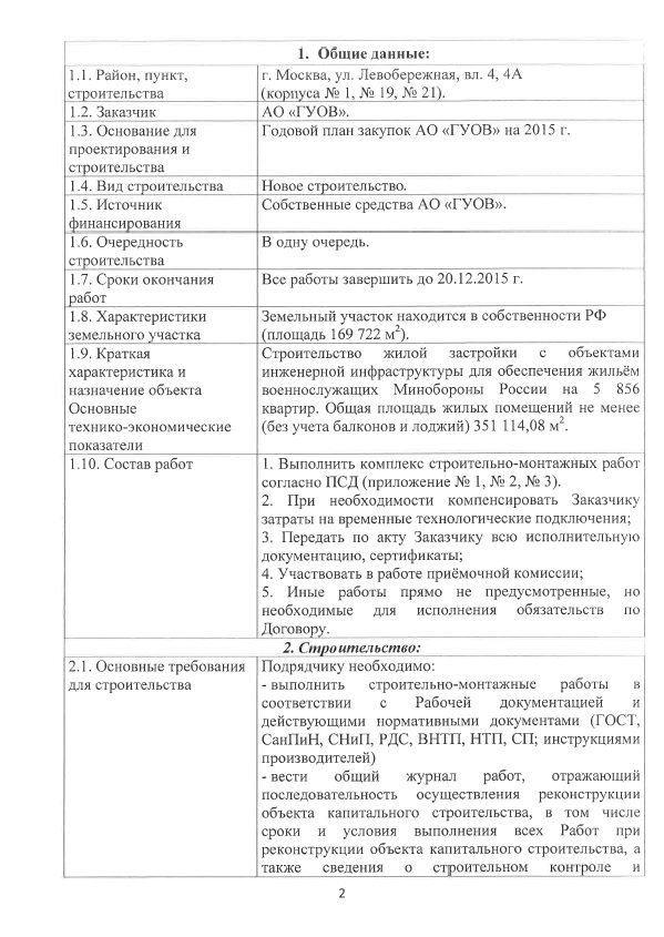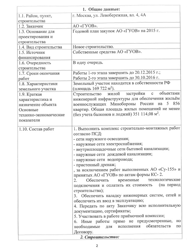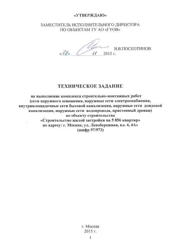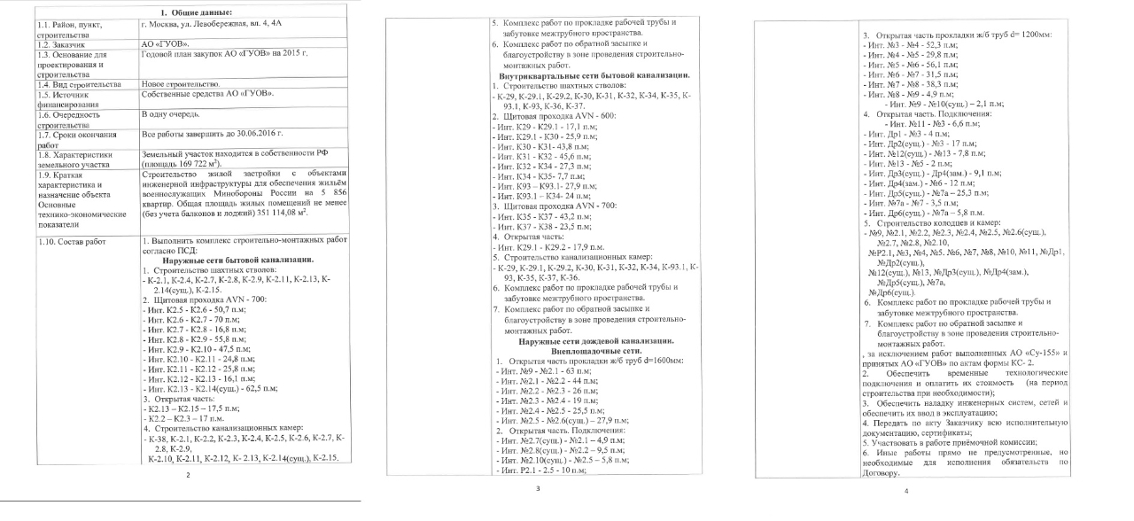 Проведение закупки у единственного поставщика на выполнение комплекса строительно-монтажных работ (сети наружного освещения, наружные сети электроснабжения, внутриплощадочные сети бытовой канализации, наружные сети дождевой канализации, наружные сети водопровода, пристенный дренаж) по объекту строительства «Строительство жилой застройки на 5 856 квартир» по адресу: г. Москва, ул. Левобережная, вл. 4, 4А (шифр 97/973)