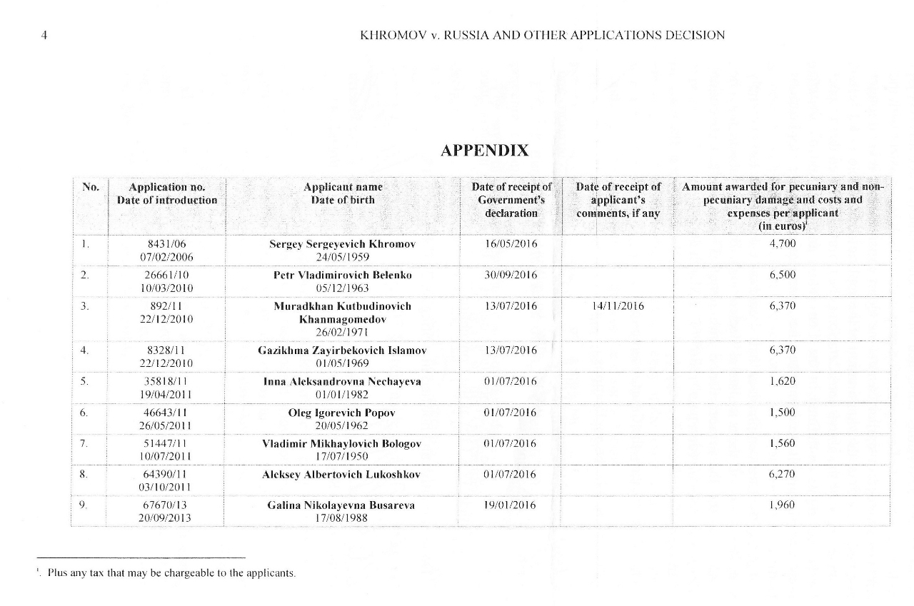 ЕСПЧ обязал Россию выплатить правозащитнику 10 тысяч евро в качестве компенсации за моральный ущерб и 1600 евро за расходы. https://crimerussia.com/gromkie-dela/es ... _id=157562