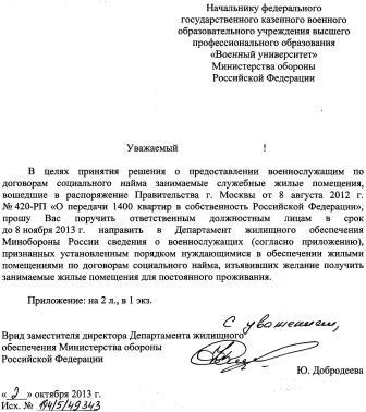 А есть приложения к письму Ю.Добродеева? На 2 листах? Что заполнять для Начальника Военного университета?Также из ДЖО пришло письмо (см. приложения) - до 08.10.2013 подать сведения о согласии признанных нуждающимися и проживающих в "служебных" квартирах "московского списка 1400 квартир слушательского фонда" на их получение. По остальным, сказали "всё будет, но чуть попозже"