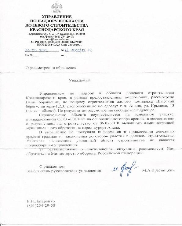 Пришел ответ из управления по надзору в области долевого строительства Краснодарского края.