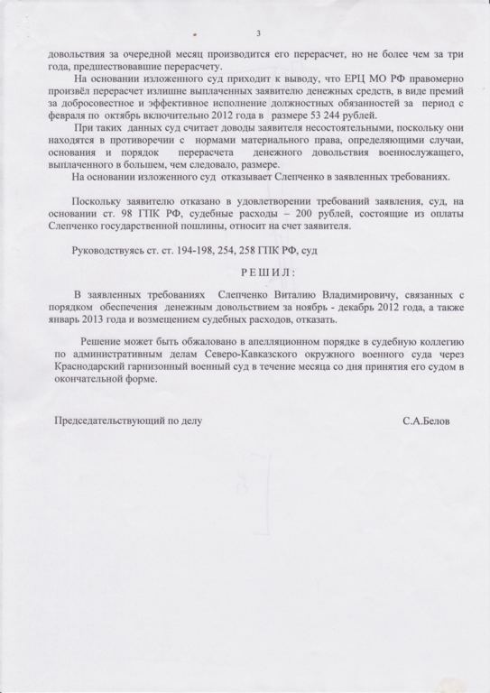 Добавлено спустя 6 минут 37 секунд:Таким образом, судебные инстанции пришли к правильному выводу о том, что руководитель Единого расчётного центра Министерства обороны Российской Федерации обоснованно пересчитал Слепченко размер денежного довольствия за ноябрь и декабрь 2012 года и январь 2013 года с учётом ранее произведенных выплат.