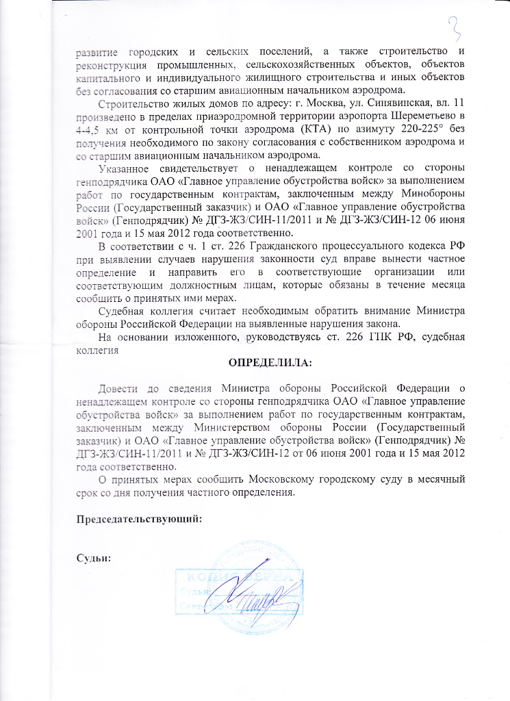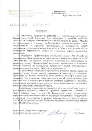 И ответ 27.06.2014г. 231 пр-ра по Синявинской: « ..Учитывая, что срок исполнения гос. контракта по подготовке проекта планирования района истек 29.05.2013г., а предусмотренные работы не завершены, для принятия мер реагирования проинформирован прокурор г. Мск… Жилой комплекс по ул. Синявинская возводится на землях и за счет МО, предназначен для проживания в/с и членов семей…… Препятствий к их заселению не имеется, квартиры переданы в ДЖО МО для последующего распределения в/с….