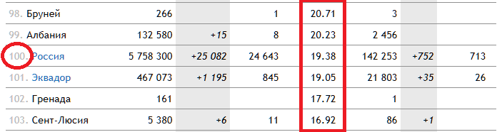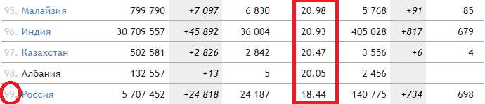 Россия в рейтинге стран по охвату населения прививками (%):
