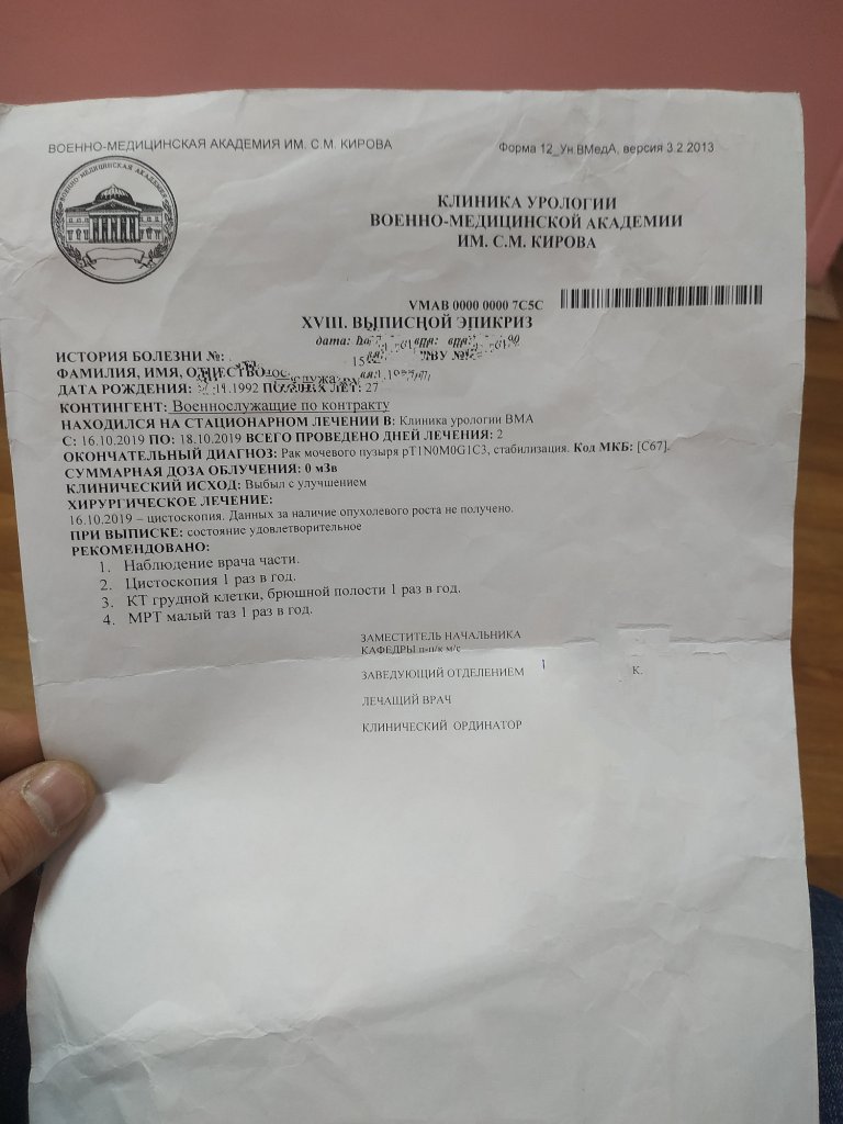 Вопрос вот в чем: я военнослужащий по контракту,была операция в 2017 году по удалению опухоли в мочевом пузыре(диагноз:рак мочевого пузыря),затем на днях лег на ВВК по направлению командира части,если смотреть по положению 565 категория годности будет В.При беседе с лечащим врачом он мне говорит что операция была в 2017 году и ни каких рецедивов нет будем тебе выносить категорию Б(сказала про какие то сроки 5 лет без рецедивов).
