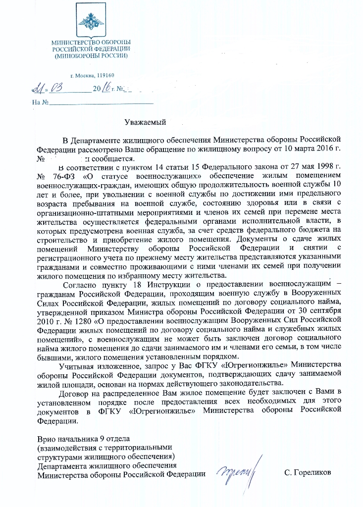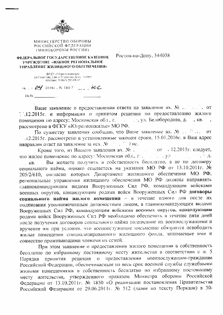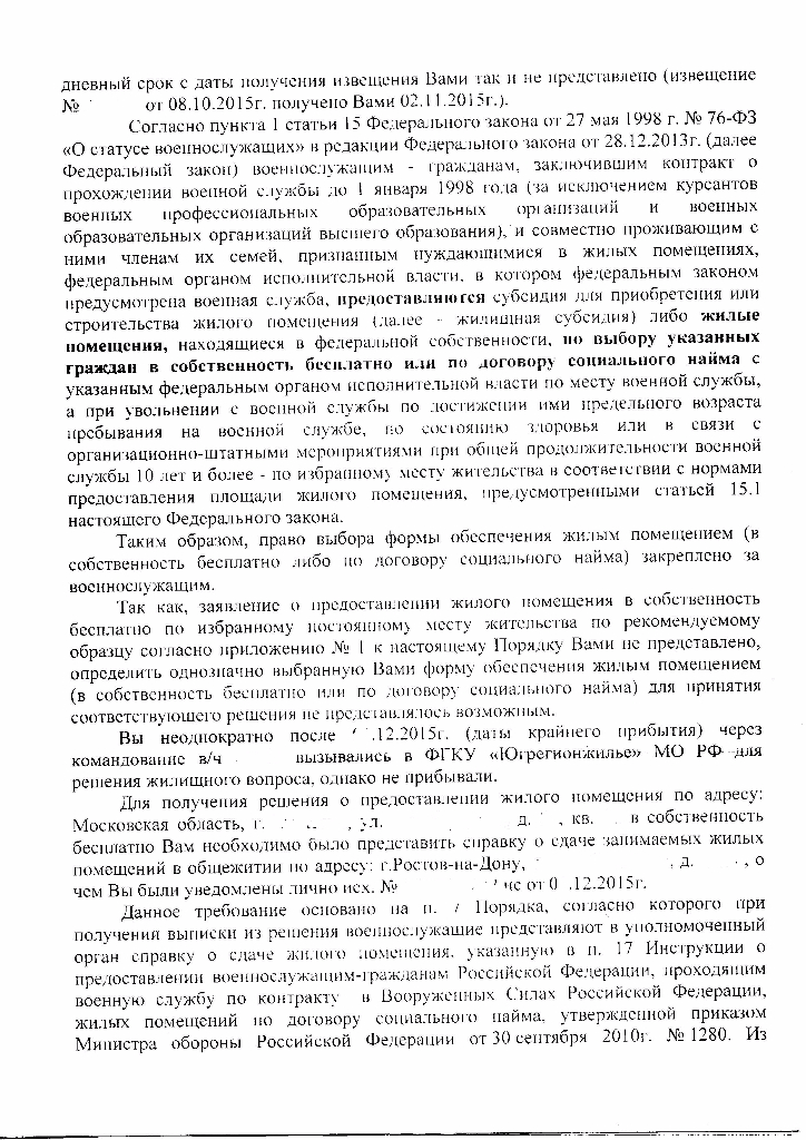 #20185Выкладываю письмо от ЮРУЖО в ответ на мое обращение от декабря 2015 года(прошло почти 4 месяца), где в кучу сплетены попытки оправдаться на мои жалобы как в ДЖО Москва, так и в прокуратуру, да еще наезжают на моего командира( он на моей стороне и он в курсе всей моей переписки).Перечень документов сдавал для оформления ЖП в собственность(он так и назывывался-перечень документов для передачи в собственнось ЖП,но не было в перечне заявления.) См.мой пост 20122 выше по тексту. Теперь ЮРУЖО изменило основание для отказа в принятии решения до предоставления справки о занимаемом ЖП.(речь идет о преславутом кастрированном п.18 Инструкции ПР.МО РФ 1280).Тем самым признало свои незаконные действия. Но теперь руководствуется п.7 Порядка(приказ 1850), где опять искажают смысл содержания НПА. В пункте 7 сначала идет речь о принятии решения , а в течение 3 дней после принятия решения доводится время и место передачи выписки(ну и как они хотят –справки от сдаче ЖП).НО справка, опять же, сдается только в случаях освобождения ЖП(п.17 Инструкции Пр.МО РФ 1280),указанных в договоре найма ЖП. Вот такие перекосы в работе ДЖО. Кстати, ответов с прокуратуры так и нет. Такое ощущение, что они находятся над схваткой «бедных военных»и «Могущественным департаментом».Будем продолжать, в суд еще не обращался, время есть.