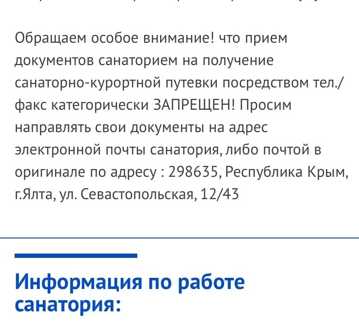 Я вообще-то спрашивал не вас. ВЛАДР написал: " вывесили объявление, по электронке не присылайте, только через Центр Туризма, через личный кабинет". Я попросил его дать ссылку на подобную информацию, чтобы не слыть болтуном. Вы решили мне показать на некую информацию санатория Ялта. Отвечу вам скринами с сайта той же Ялты.