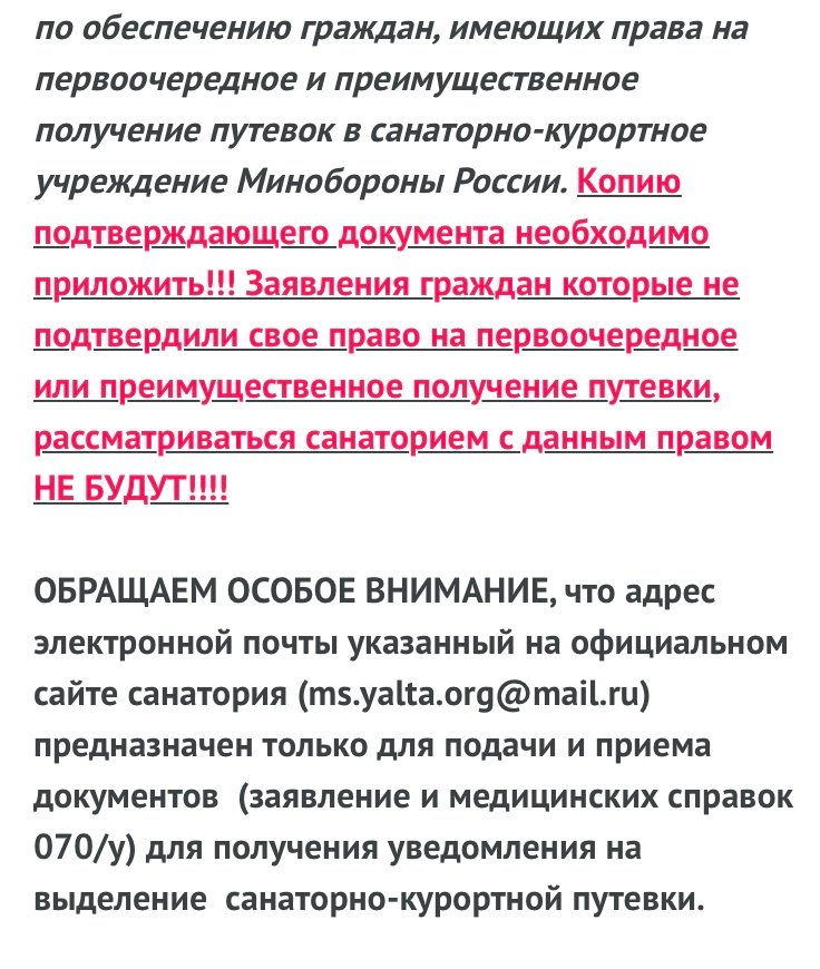 #20298Даже на главной есть АДРЕС для подачи заявок!!!!!Прошу меня извинить, что вмешался в вопрос, обращенный к другому. Да, действительно, приведенная информация в Ваших скринах взята со странички ИНФОРМАЦИЯ ДЛЯ ЛИЦ ЛЬГОТНОЙ КАТЕГОРИИ МО РФ https://vs-yalta.ru/info .