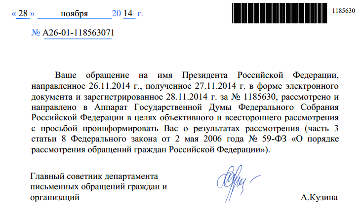 Ваше обращение на имя Президента Российской Федерации, направленное 26.11.2014, полученное 27.11.2014… зарегистрированное 28.11.2014 направлено в Аппарат Госдумы.