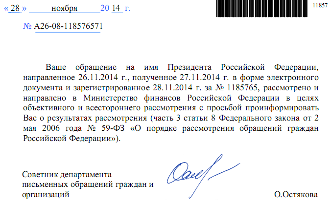 29 ноября 2014 г. мною получено уведомление от Советника департамента письменных обращений граждан и организаций О. Остяковой от 28.11.2014 г. № А26-08-118576571 о направлении обращения в Министерство финансов Российской Федерации. Считаю действия Советника департамента письменных обращений граждан и организаций О. Остяковой незаконными.