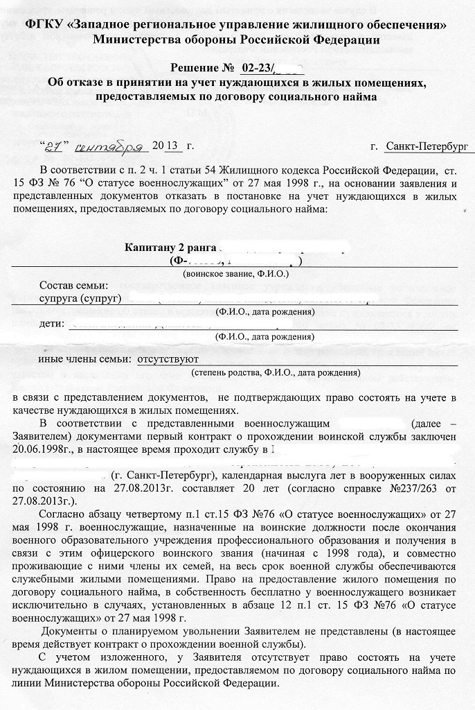 И сегодня другому сослуживцу, выпускнику 1998 года (имеющему в настоящее время служебное жилье), пришло заказным письмом решение из ЗРУЖО о постановке на учет