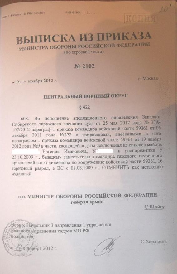 Судья в протоколе мне приписал, что я ходатйствовал о приобщении к делу телеграммы, которую мне прислала жена командира Салдина л.В.13 ноября 2012г...."Е. И., вы находитесь в отпусках за 2012, 2013гг"... При этом меня никто, ни КЧ, ни ВК не уведомили, что приказ на исключение (старый) в отношении меня отменен, а про новый приказ МО, отменивший приказ КЧ на исключение, меня впервые уведомил суд только 28 ноября 2012г.